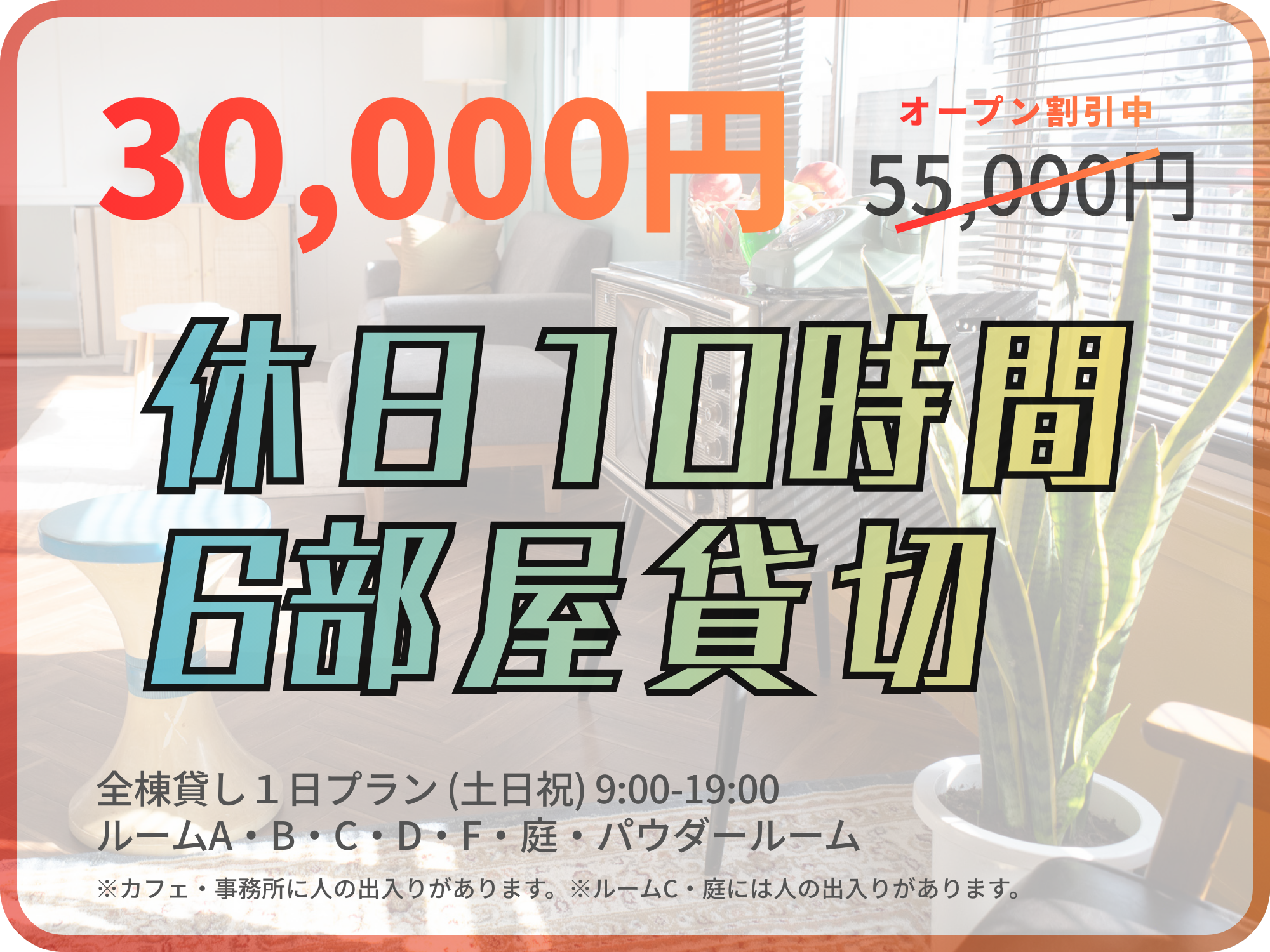 (ルームABCDF・メイクルーム) 約150㎡ / 庭利用可 | 6,000円 おトク! | 3,000円 おトク! | 30,000円 おトク! | 15,000円 おトク! | 70,000円 おトク! |