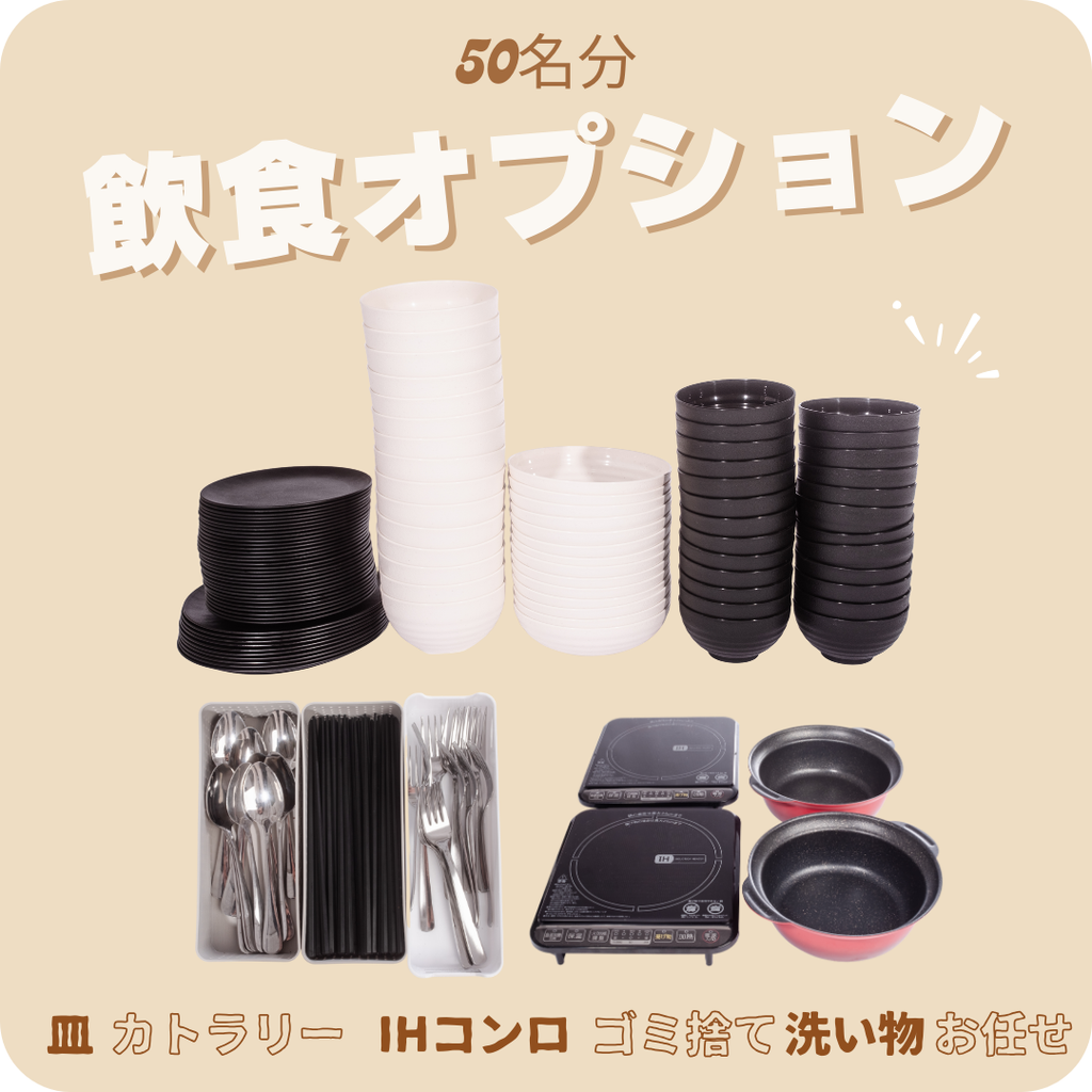 | 飲食オプション (パーティー・オフ会利用) ※全棟貸しのみ | 全部屋 | 2,000円 / h | ・カトラリー(50人分の皿、箸、フォークなど) ・折りたたみ大型机3つ ・椅子50脚 ・IHコンロ2つ ・IH鍋2つ |